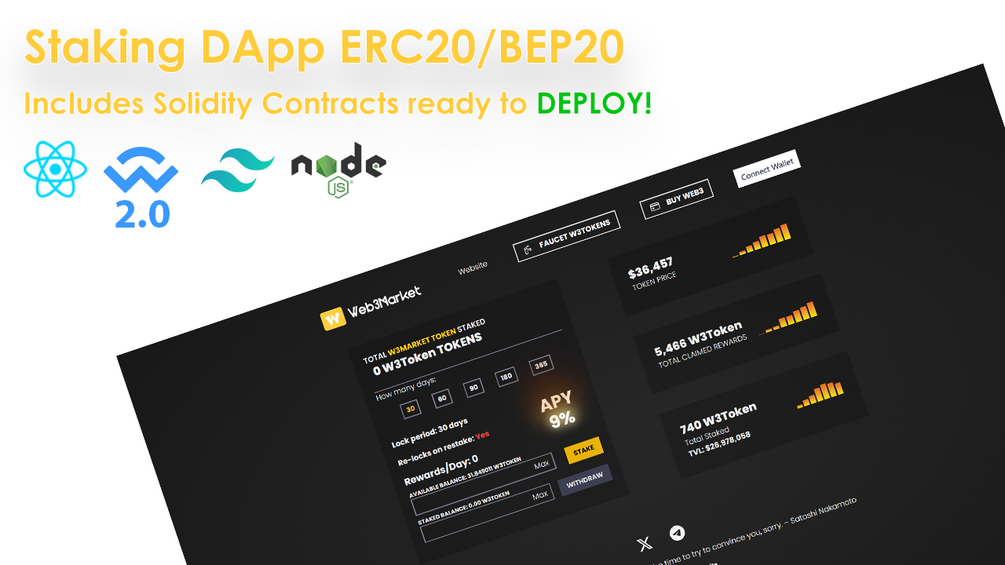 You'll get a modern Web3 Staking DApp which integrates the latest technologies (wagmi/WalletConnect v2 and more). Multiple wallet providers supported!